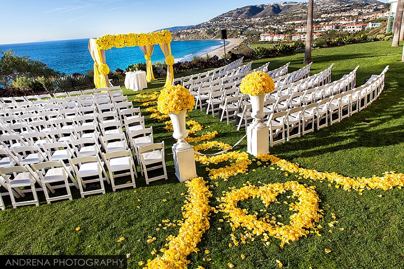 Deborah and Sean were married in a beautiful Sephardic Orthodox Jewish wedding ceremony on a blustery winter’s day at the stunning Ritz-Carlton Laguna Niguel in Dana Point, California. I love photographing Jewish weddings because there are so many wonderful traditions involved with each and every event. Deborah chose a stunning yellow decor motif for her flowers and chuppah, taking care to make sure that the yarmulkes were also a fun yellow hue. The end result with a beautiful complement to the azure blue waters of the Laguna Niguel coastline. One of my favorite parts of the wedding ceremony was when Sean danced down the aisle to meet his bride and her parents. All the guests and family members were clapping as Sean did his traditional dance with great theatrical effect. I just loved it. He then danced for her again right before we went to the beach to do some after-ceremony portraits.