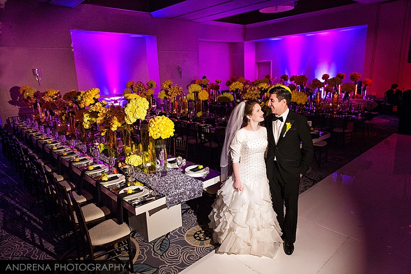 The reception took place in the Ritz-Carlton Pacific Promenade Ballroom, which is a lovely room for a party as it provides privacy and some wonderful ocean views just outside the building. The reception was a lovely affair with a fabulous Horah followed by a wedding feast, more dancing and then benching (a set of Hebrew blessings). The Horah is traditionally danced to Hava Nagila and can go on for an hour or more. I’ve always thought the key was to completely exhaust the bride and groom, but the endless dancing is really just to celebrate the joy of the couple’s wedding. It’s every photographer for herself (or himself) while trying to photograph a Horah, and most experienced Jewish wedding photographers agree that a perch atop a ladder provides the best vantage point. I’ve included one of my favorite engagement photos of Deborah and Sean at the end of this post. Sadly, that beautiful painting of textbooks is now gone, having been replaced by a sad shade of solid gray paint.