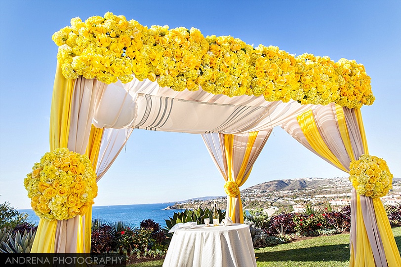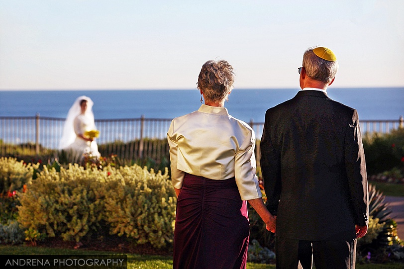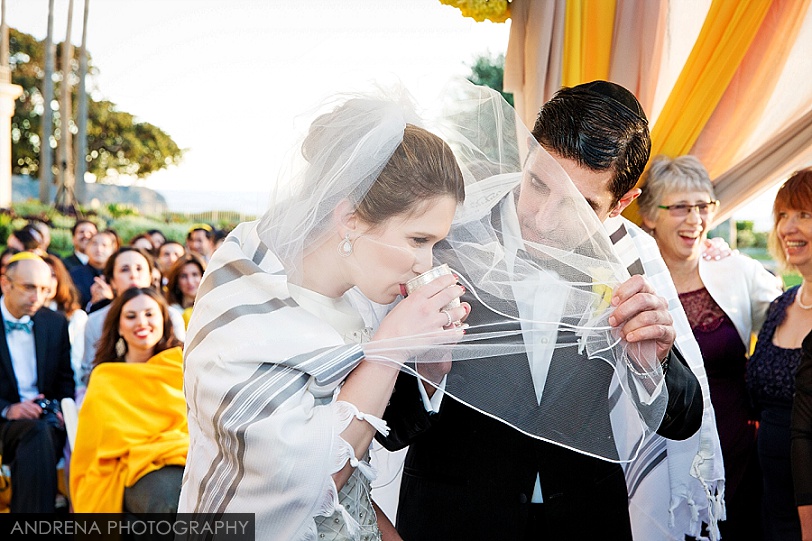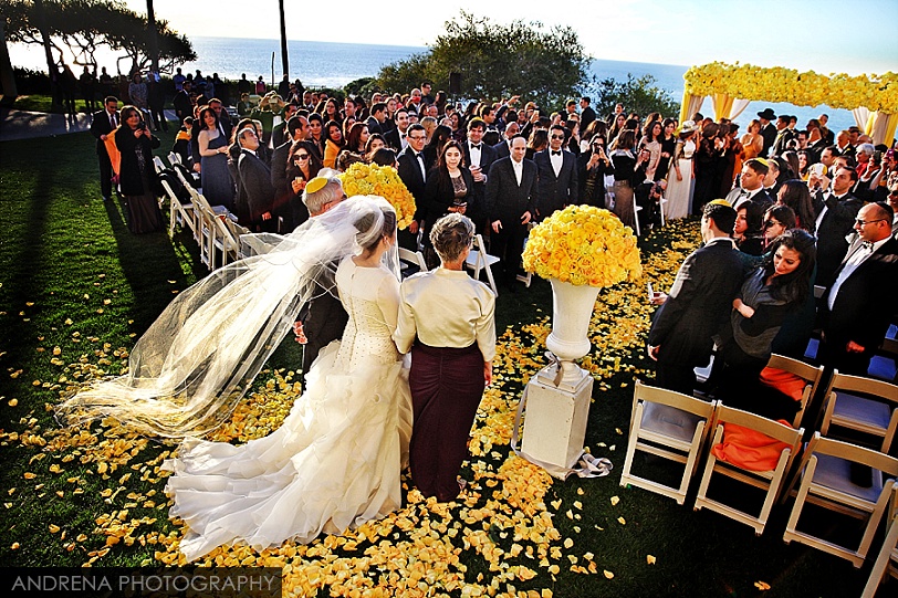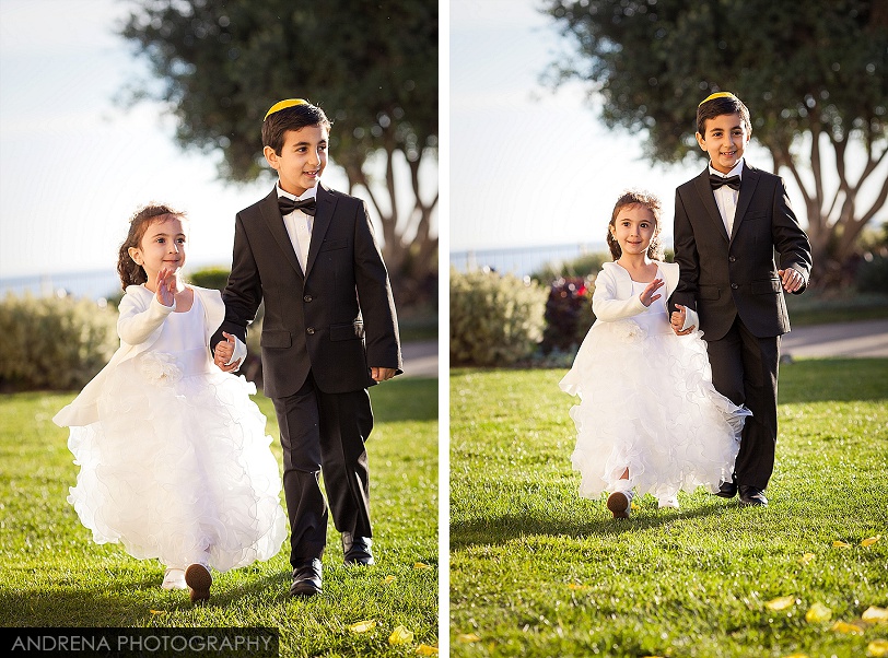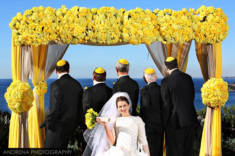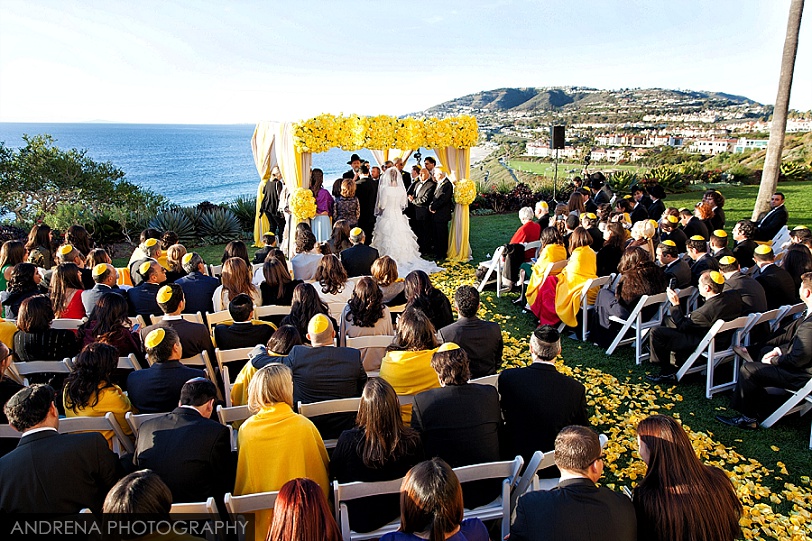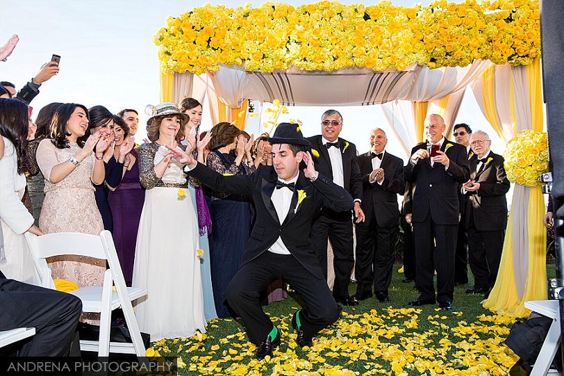 Deborah and Sean were married in a beautiful Sephardic Orthodox Jewish wedding ceremony on a blustery winter’s day at the stunning Ritz-Carlton Laguna Niguel in Dana Point, California. I love photographing Jewish weddings because there are so many wonderful traditions involved with each and every event. Deborah chose a stunning yellow decor motif for her flowers and chuppah, taking care to make sure that the yarmulkes were also a fun yellow hue. The end result with a beautiful complement to the azure blue waters of the Laguna Niguel coastline. One of my favorite parts of the wedding ceremony was when Sean danced down the aisle to meet his bride and her parents. All the guests and family members were clapping as Sean did his traditional dance with great theatrical effect. I just loved it. He then danced for her again right before we went to the beach to do some after-ceremony portraits.