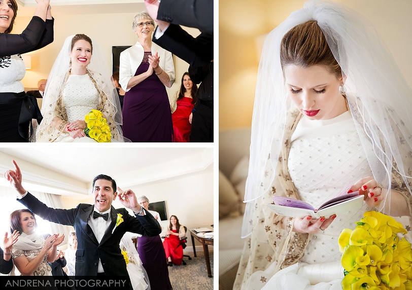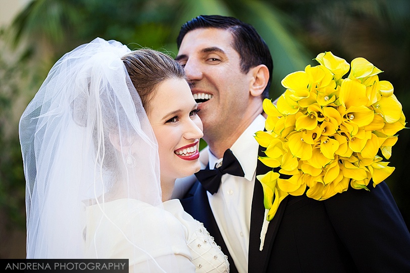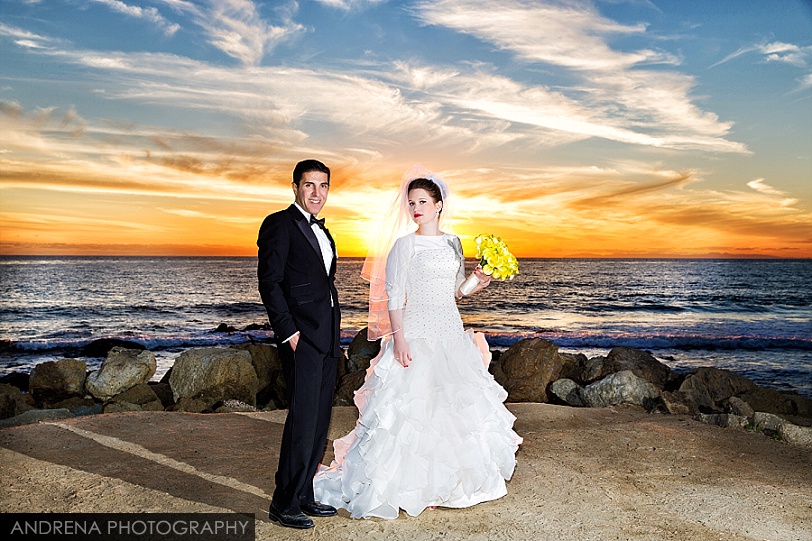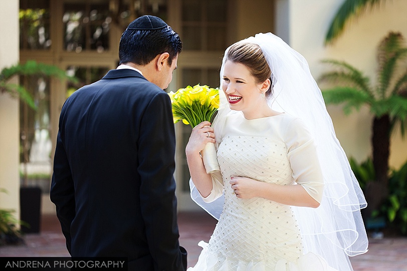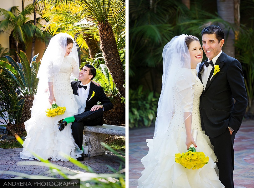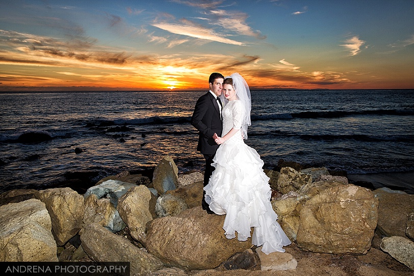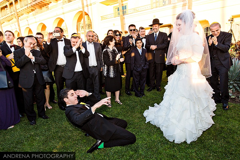 Deborah and Sean were married in a beautiful Sephardic Orthodox Jewish wedding ceremony on a blustery winter’s day at the stunning Ritz-Carlton Laguna Niguel in Dana Point, California. I love photographing Jewish weddings because there are so many wonderful traditions involved with each and every event. Deborah chose a stunning yellow decor motif for her flowers and chuppah, taking care to make sure that the yarmulkes were also a fun yellow hue. The end result with a beautiful complement to the azure blue waters of the Laguna Niguel coastline. One of my favorite parts of the wedding ceremony was when Sean danced down the aisle to meet his bride and her parents. All the guests and family members were clapping as Sean did his traditional dance with great theatrical effect. I just loved it. He then danced for her again right before we went to the beach to do some after-ceremony portraits.