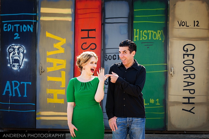 The reception took place in the Ritz-Carlton Pacific Promenade Ballroom, which is a lovely room for a party as it provides privacy and some wonderful ocean views just outside the building. The reception was a lovely affair with a fabulous Horah followed by a wedding feast, more dancing and then benching (a set of Hebrew blessings). The Horah is traditionally danced to Hava Nagila and can go on for an hour or more. I’ve always thought the key was to completely exhaust the bride and groom, but the endless dancing is really just to celebrate the joy of the couple’s wedding. It’s every photographer for herself (or himself) while trying to photograph a Horah, and most experienced Jewish wedding photographers agree that a perch atop a ladder provides the best vantage point. I’ve included one of my favorite engagement photos of Deborah and Sean at the end of this post. Sadly, that beautiful painting of textbooks is now gone, having been replaced by a sad shade of solid gray paint.