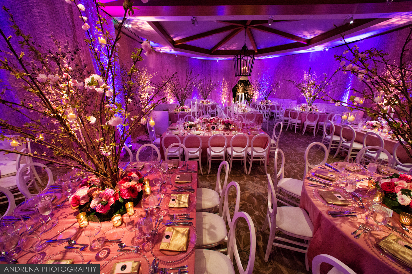 - Cherry blossom trees atop tables of differing shapes helped lend a modern flair to this pink-themed bat mitzvah in Beverly Hills, California.